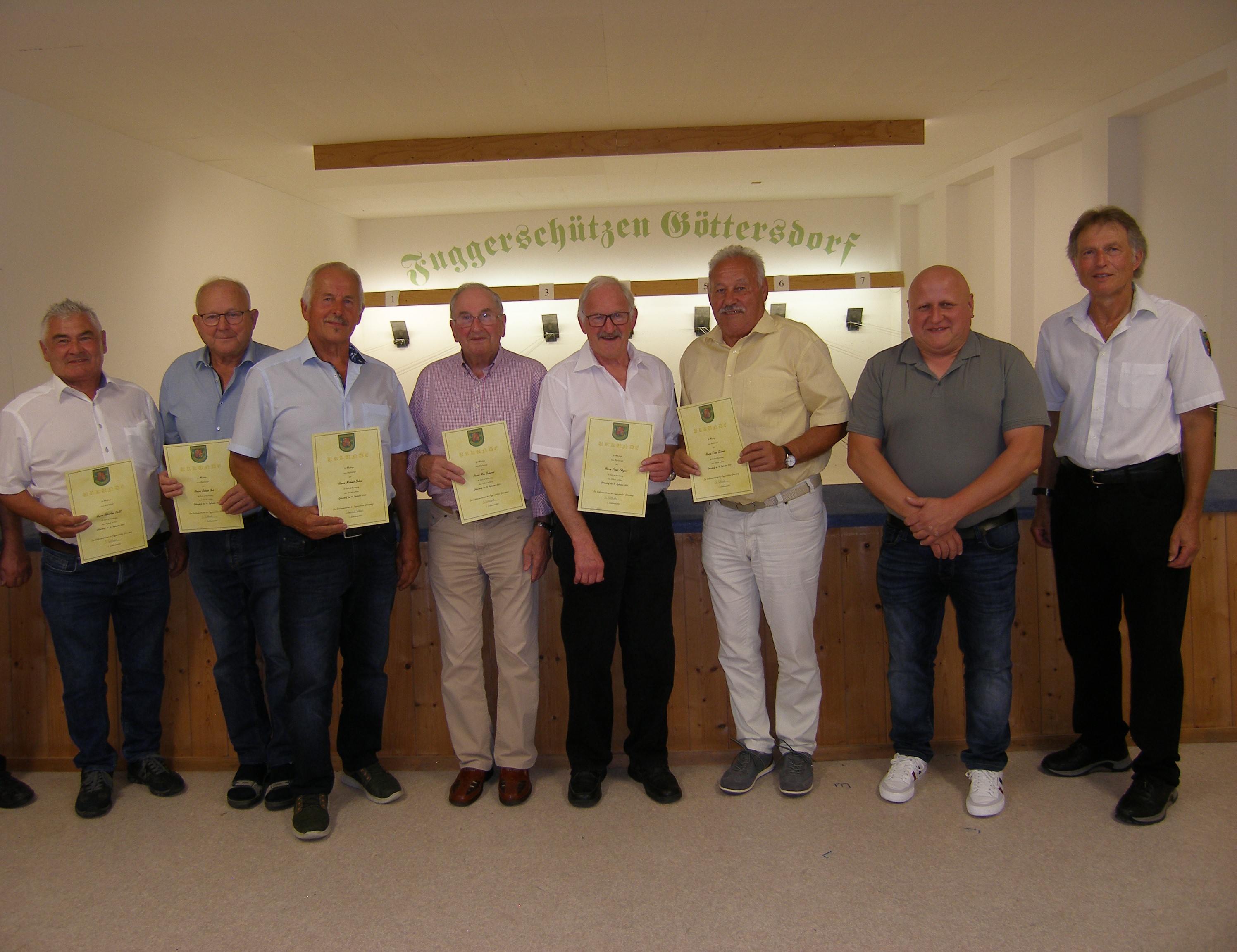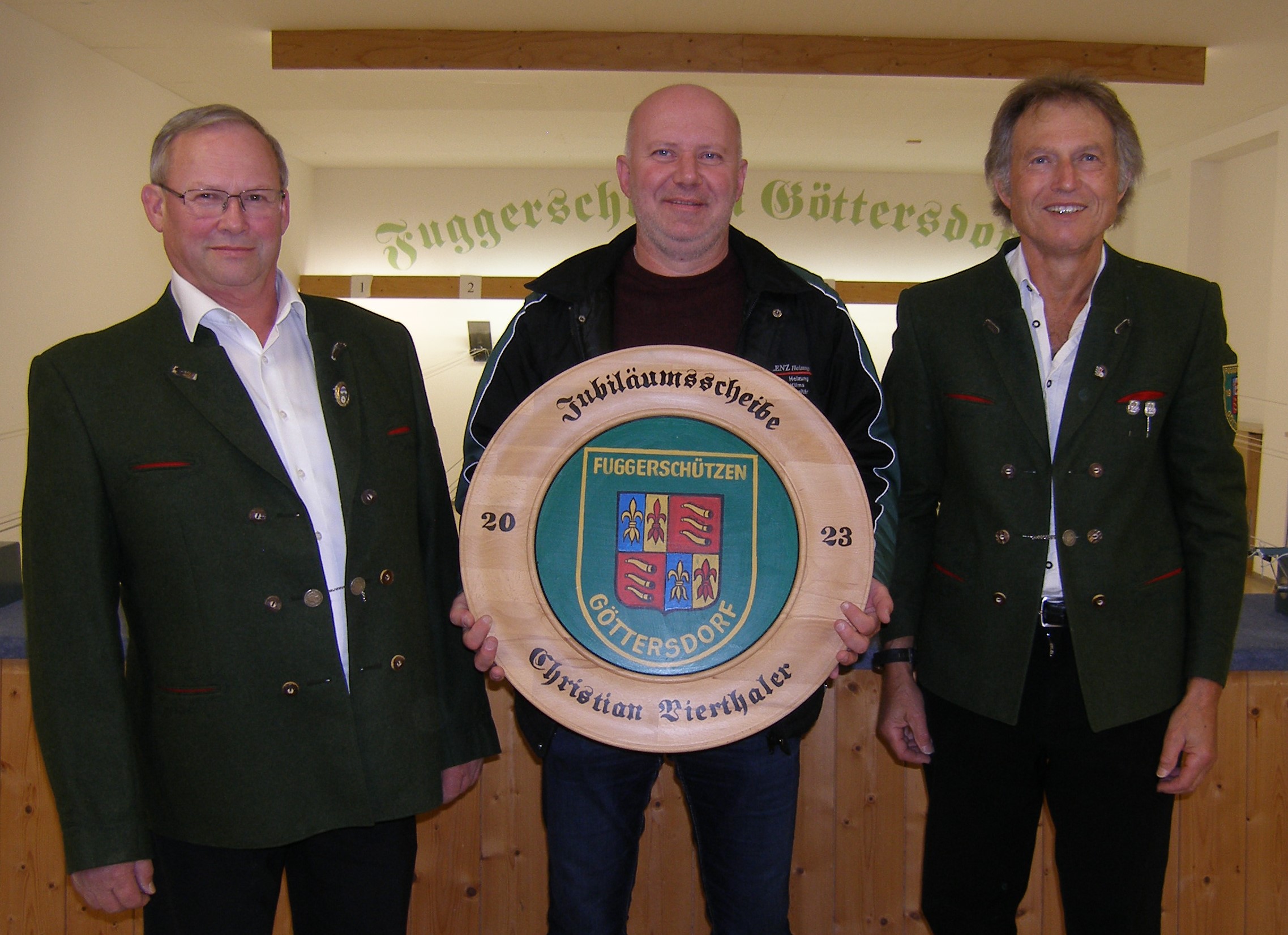 Christian Vierthaler ist Gewinner der Jubiläumsscheibe der Fuggerschützen Göttersdorf. Die Fuggerschützen Göttersdorf begehen in diesem Jahr ihr 100jähriges Bestehen. Aus diesem Grunde wurde im Oktober eine Jubiläums-Schützenscheibe ausgeschossen. Bei der Überreichung der Scheibe am Freitagabend, 3. November 2023 bedankte sich 1.Schützenmeister Siegmund Eiblmeier zunächst bei Hans Schwinghammer für das Stiften der Holzscheibe und bei Michael Beham für das Bemalen. Nach dem er sich bei den Schützenkameraden für die Teilnahme bedankt hatte, überreichte er zusammen mit 2. Schützenmeister Hans Schwinghammer die Jubiläumsscheibe an Christian Vierthaler. Dieser hatte mit einem 5,1 Teiler das beste Blattl, gefolgt von Franz Sales Bauer mit einem 5,5 Teiler, Michael Beham 12 Teiler, Siegmund Eiblmeier 20 Teiler, Hans Schwinghammer 23 Teiler.